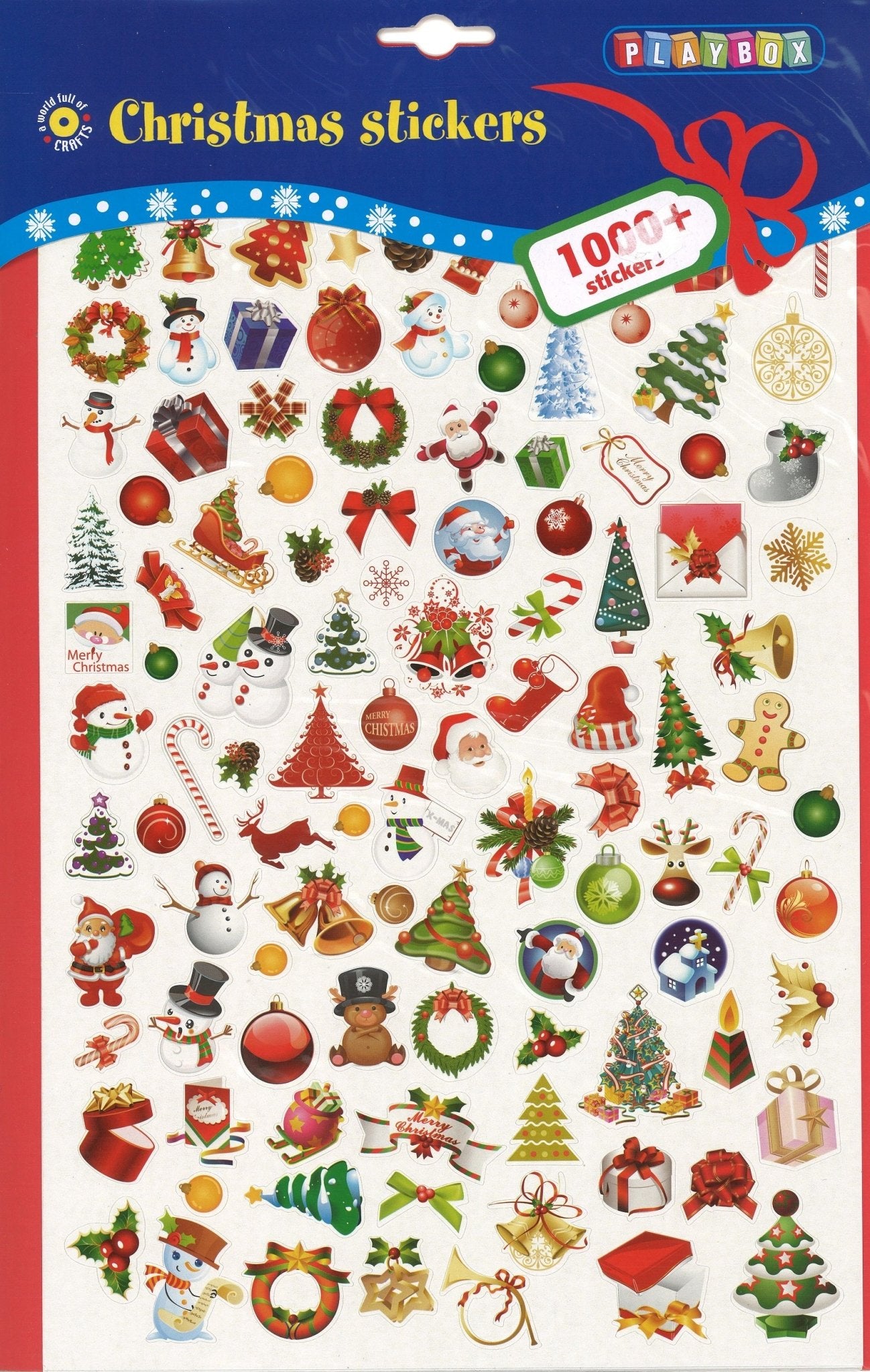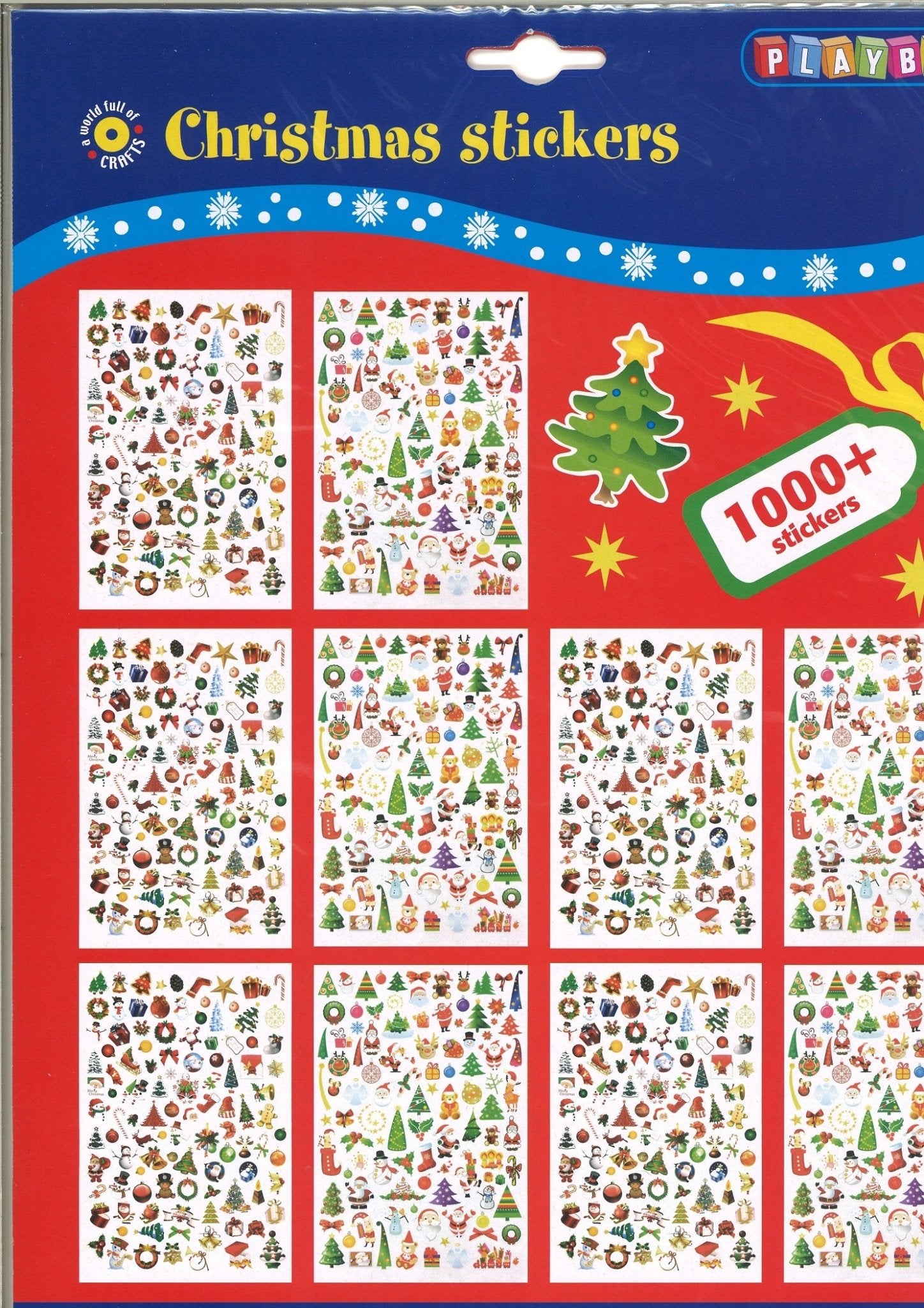 Pakke med ti stickers ark, tilsammen 1000stk julestickers. Flott til å dekorere pakker, julekort og merkelapper med.