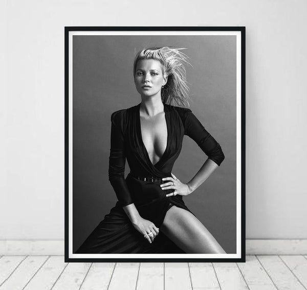 Plakat av ikoniske Kate Moss. Plakaten er trykket med en hvit kant rundt motivet, som et passepartout.