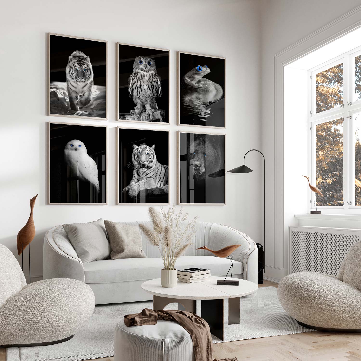 Plakaten har en mørk baggrund og en ugle med isnende blå øjne. Ser meget stilfuldt ud på en billedvæg sammen med vores andre plakater fra samme serie.