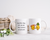 Kruset er trykket med tekst på ene siden, og ett morsomt bildet av en pizza og ananas på andre siden.