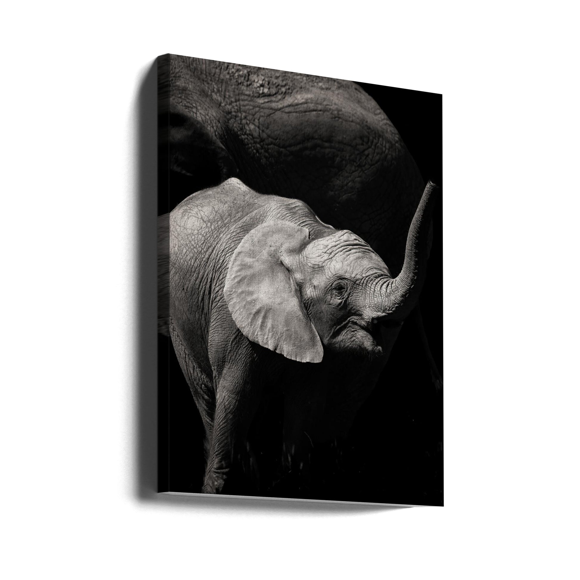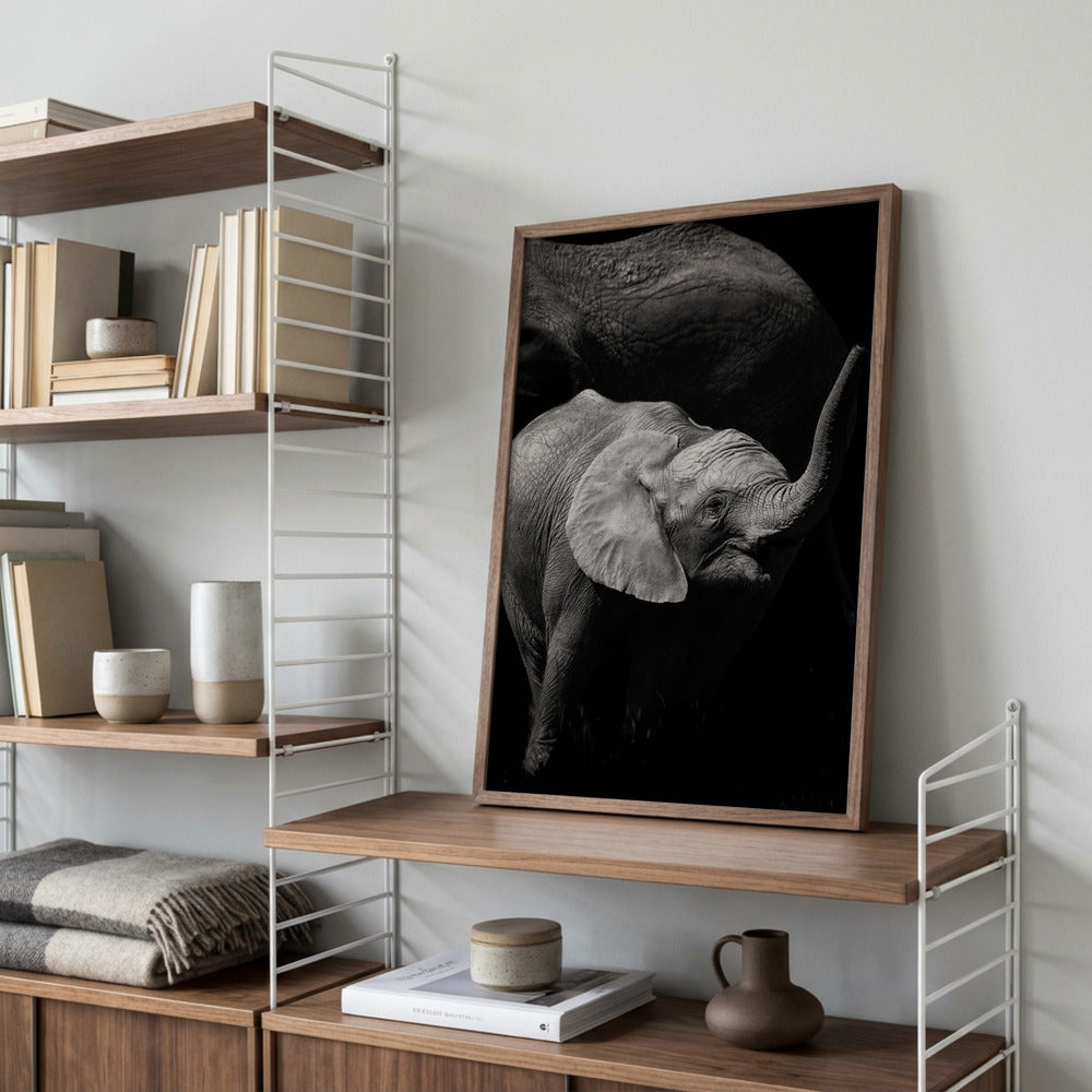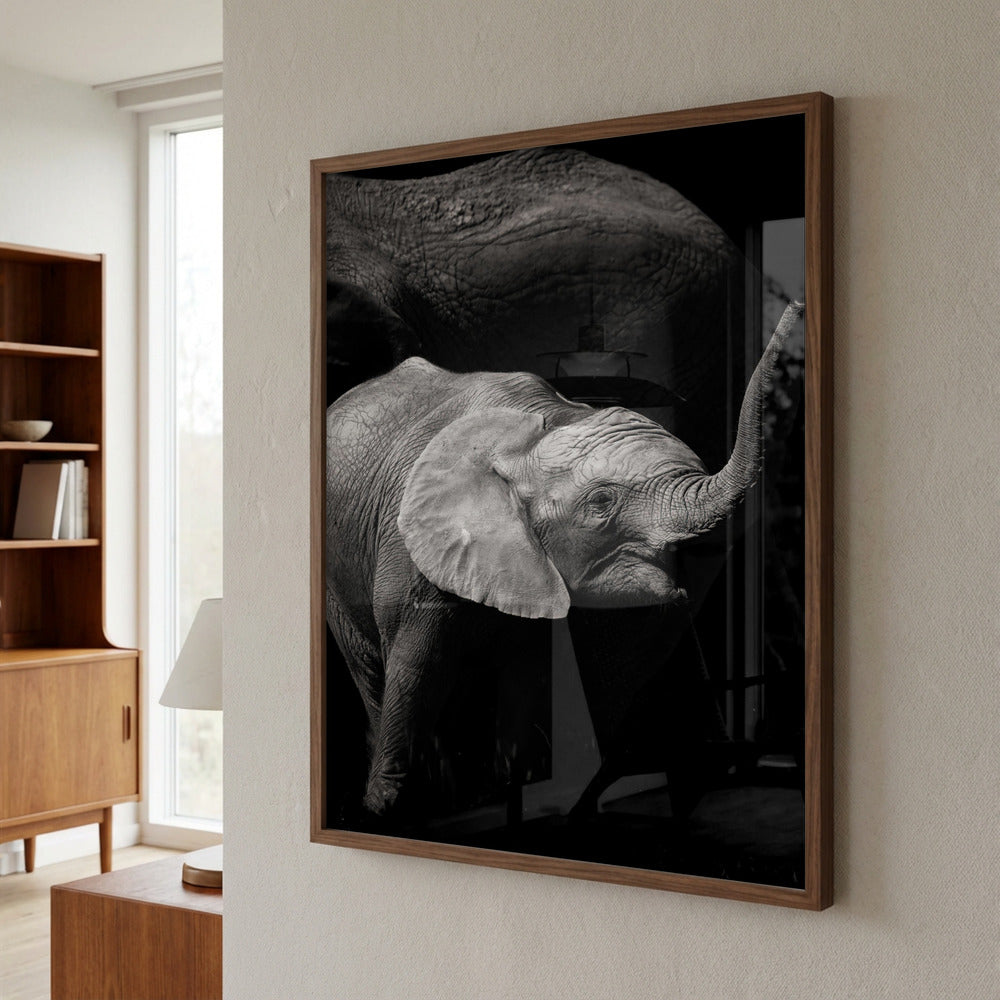 Baby elephant under mum's protecction av carmenvillar. Kan kjøpes som plakat eller lerret.