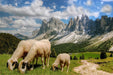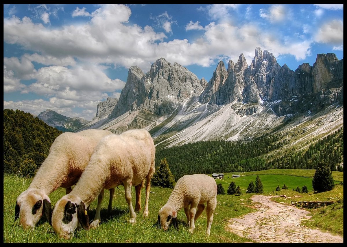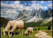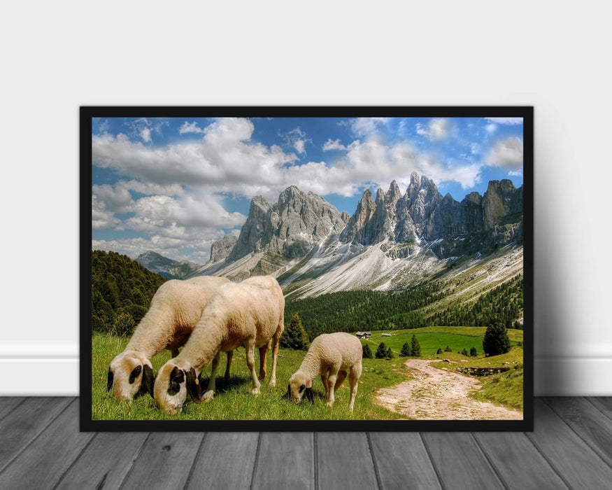 En nydelig plakat av beitende sauer og med en flott fjellkjede i bakgrunnen.