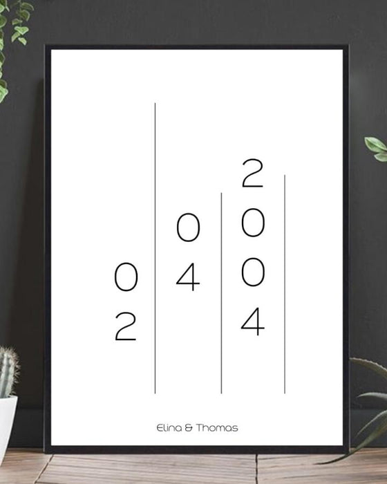 Datoplakat med stilrent design. Du velger selv navn og dato på plakaten. Skriv inn navnet til deg selv og din kjære og velg hvilke dato du vil ha på plakaten. Det kan for eksempel være dato for når dere ble sammen, bryllupsdato eller en annen dato som betyr noe spesielt for dere.