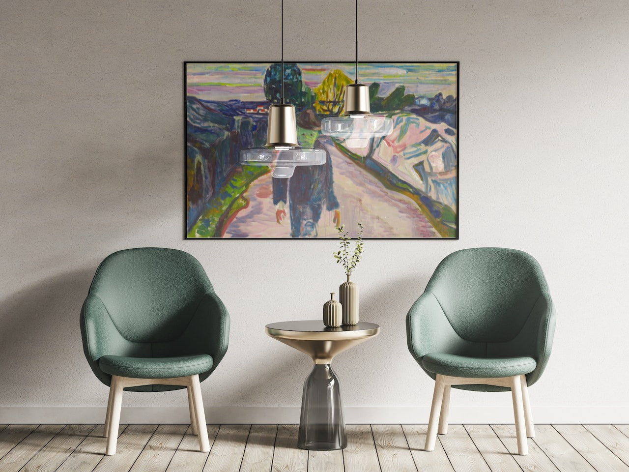 • Etter printing spennes lerretsduken på en kraftig blindramme. For de fleste formatene bruker vi en 40mm tykk ramme, slik at det oppnås en flott dybde-effekt når rammen henges på veggen. Deretter monterer vi på oppheng med stålvaier og kunstverket ditt kan henges rett på vegg.
