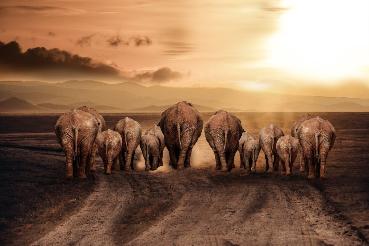 Spesiell poster av elefantflokk som går på rekke over en støvete savanne i praktfull kveldslys.