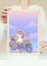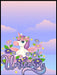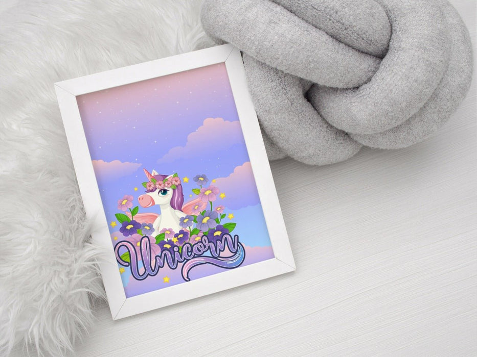 Plakat av enhjørning med blomsterkrans og blomster rundt seg. Fin å pynte veggen på rommet til ungene med. Kombiner gjerne med flere plakater og lag en bildevegg.
