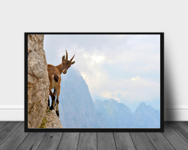 Plakat av en luftig fjellgeit i et fjell landskap i Italia.