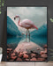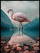 Naturplakat med flamingo og flotte fjell i bakgrunnen.