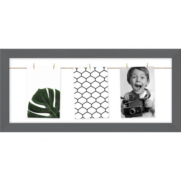 Fotogalleri ramme laget i tremateriale. Leveres med tråd og klyper for din egen plassering av bilder og elementer. Størrelsen på rammen er 20x50cm og leveres uten glass.