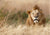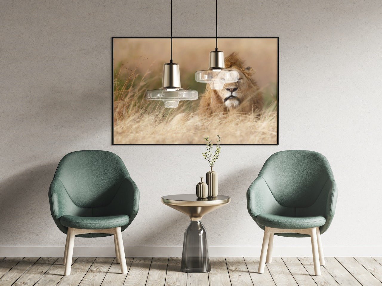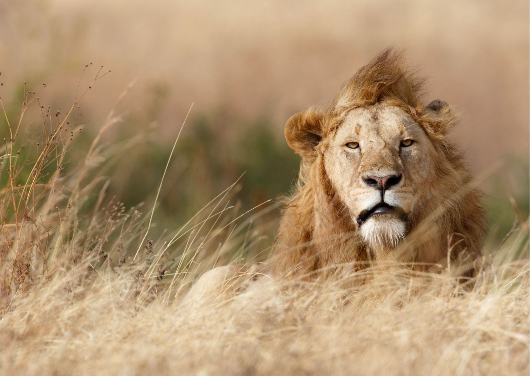 Plakat av en praktfull hannløve i gresset.
