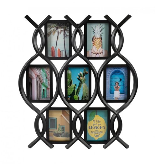 Helt ny collageramme i moderne look/design. Rammen har plass til syv bilder i 10x15cm. Rammen er laget i kunststoff materiale. Feste for oppheng på vegg. Yttermål på rammen er 58x51cm.