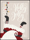 En fin og morsom juleplakat av nissen hengende fast i julelys.