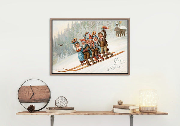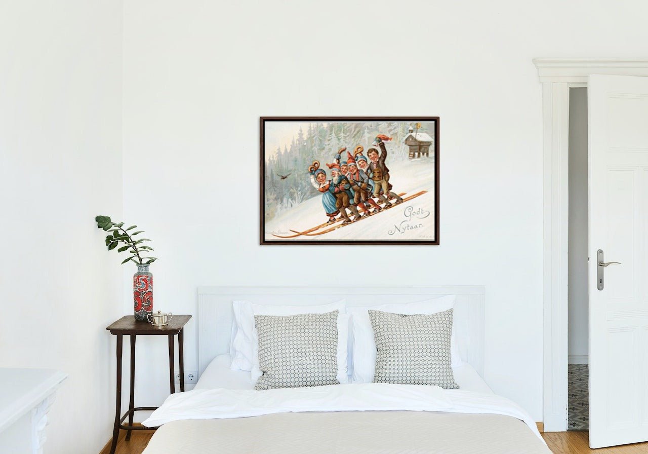- Etter printing spennes lerretsduken på en kraftig blindramme. For de fleste formatene bruker vi en 40mm tykk ramme, slik at det oppnås en flott dybde-effekt når rammen henges på veggen. Deretter monterer vi på oppheng med stålvaier og kunstverket ditt kan henges rett på vegg.