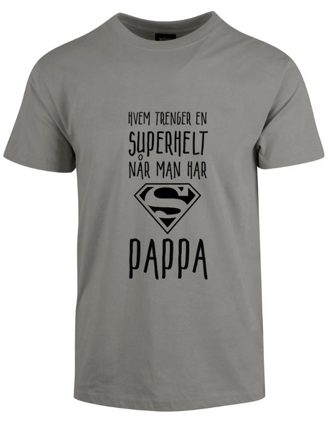 Denne t-skjorten med teksten "Hvem trenger en superhelt – når man har pappa!" er en perfekt gave til farsdag, bursdag eller bare som en hyggelig overraskelse fra barna. Enkelt, ekte og rørende – akkurat som pappa selv.