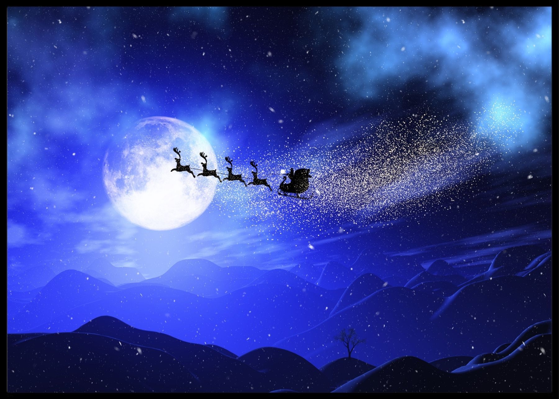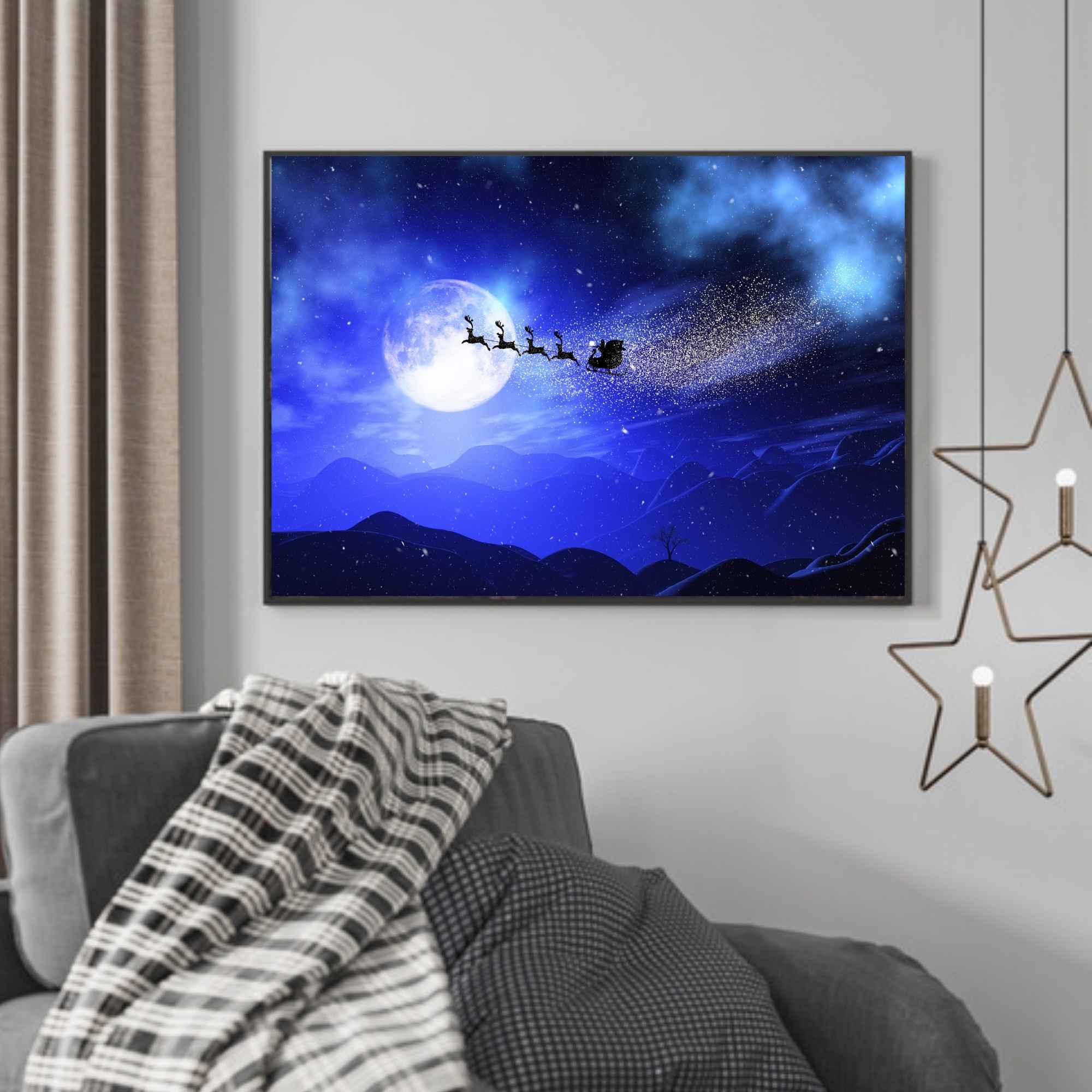 Poster av julenissen som sammen med sine reinsdyr og sleden, farer over nattehimmelen og månen.