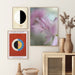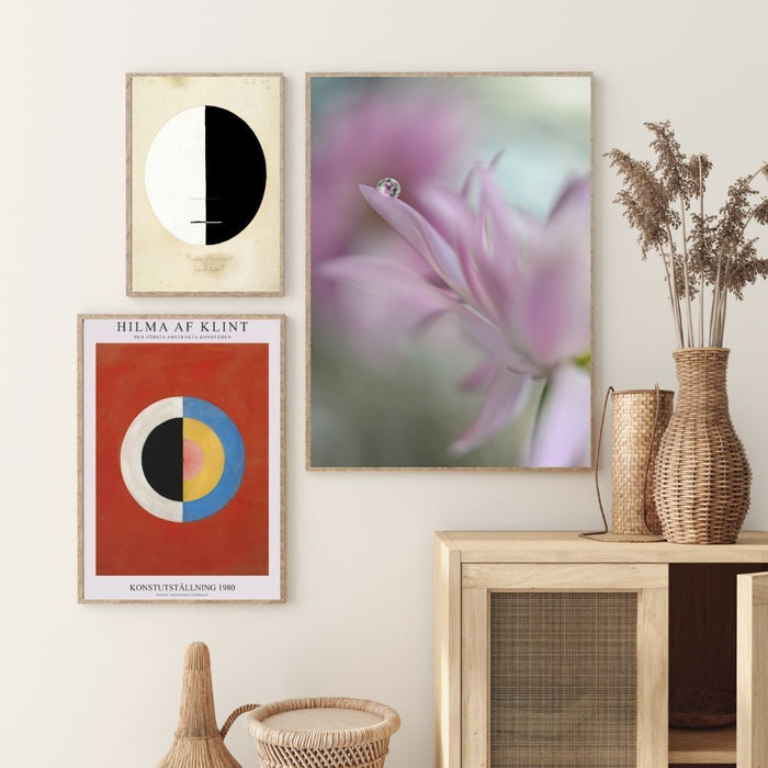 Plakat av blomster, vanndråpe og mint grønne fargetoner.