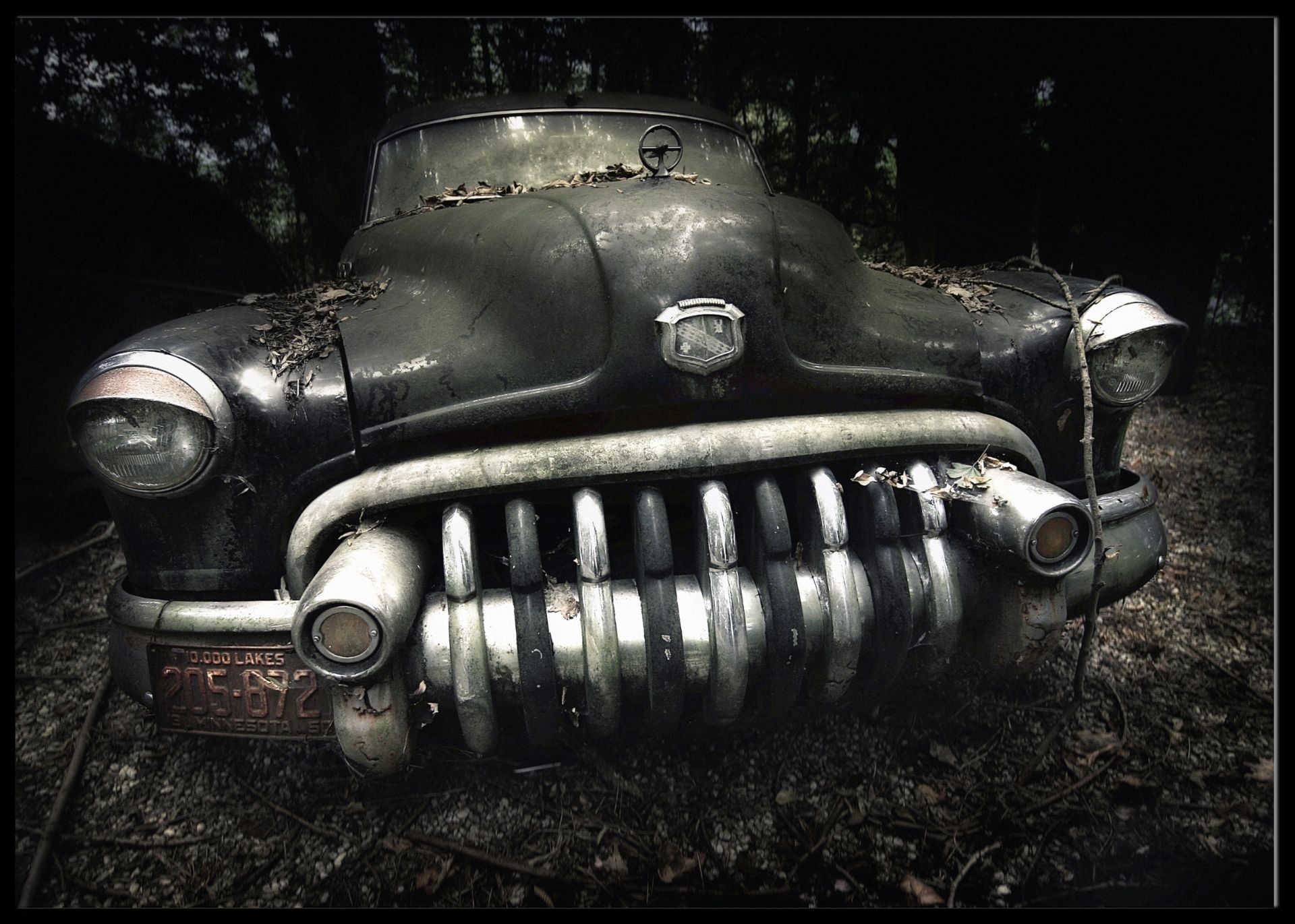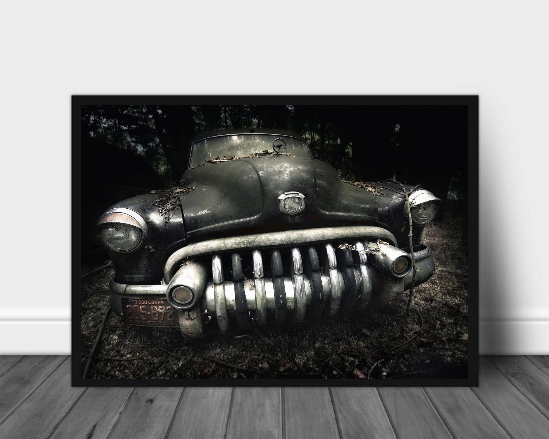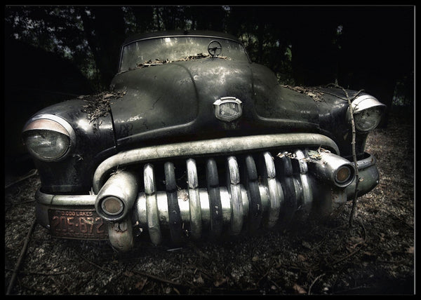 Plakat med bilde av "fjeset" til en gammel Buick.