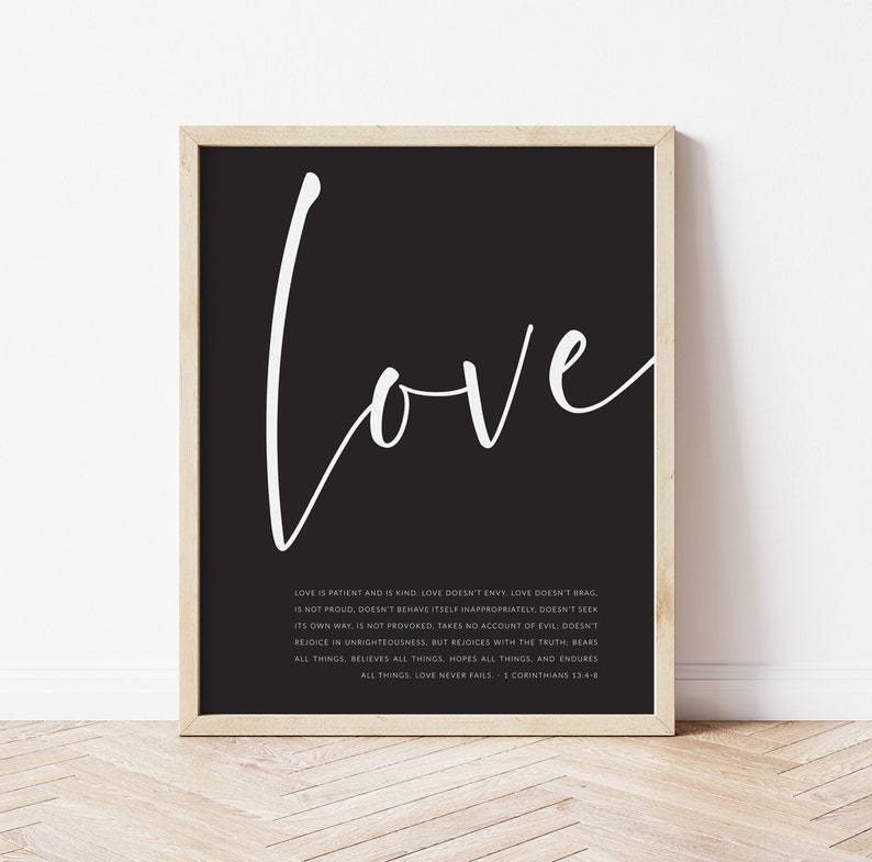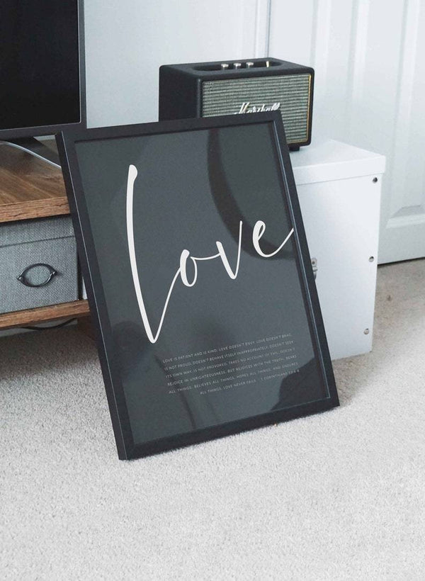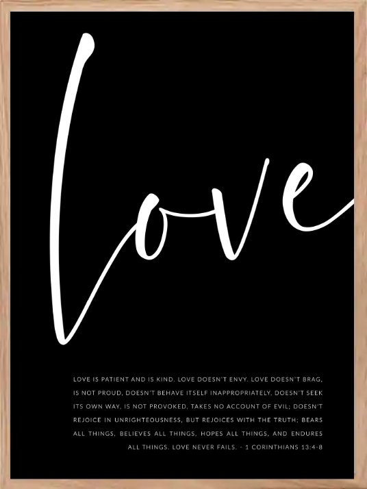 Svart og hvitt bibelversplakat for hjemmet ditt. 1 Korinter 13:4-8 - "Love is patient and is kind..."