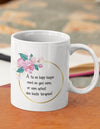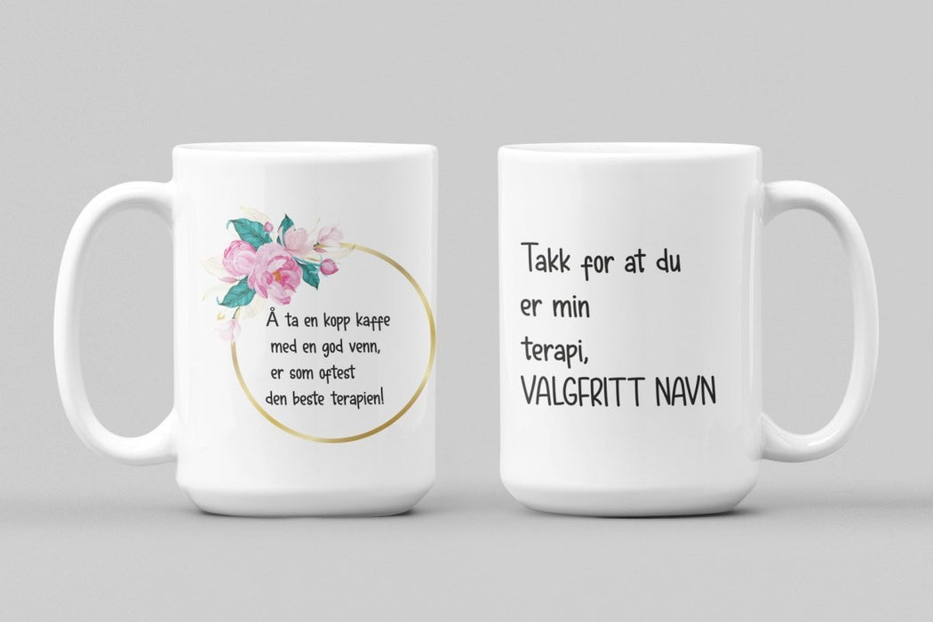 På den ene siden av kruset er det pyntet med blomster og en gullsirkel, i sirkelen står det: