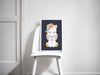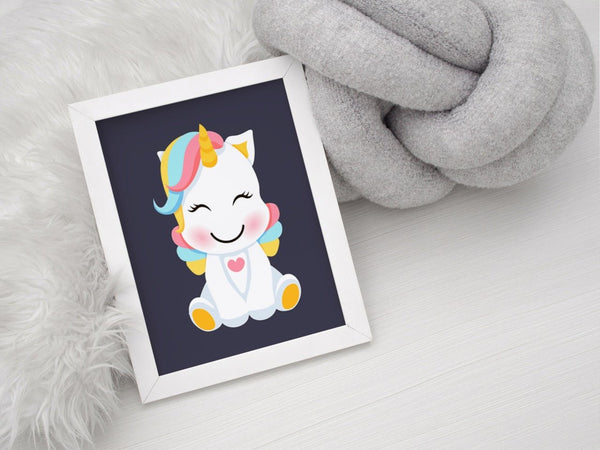 Plakat av en liten enhjørning med svart bakgrunn. Fin å pynte rommet til de aller minste med. Kombiner gjerne med andre plakater, og lag en fin bildevegg.