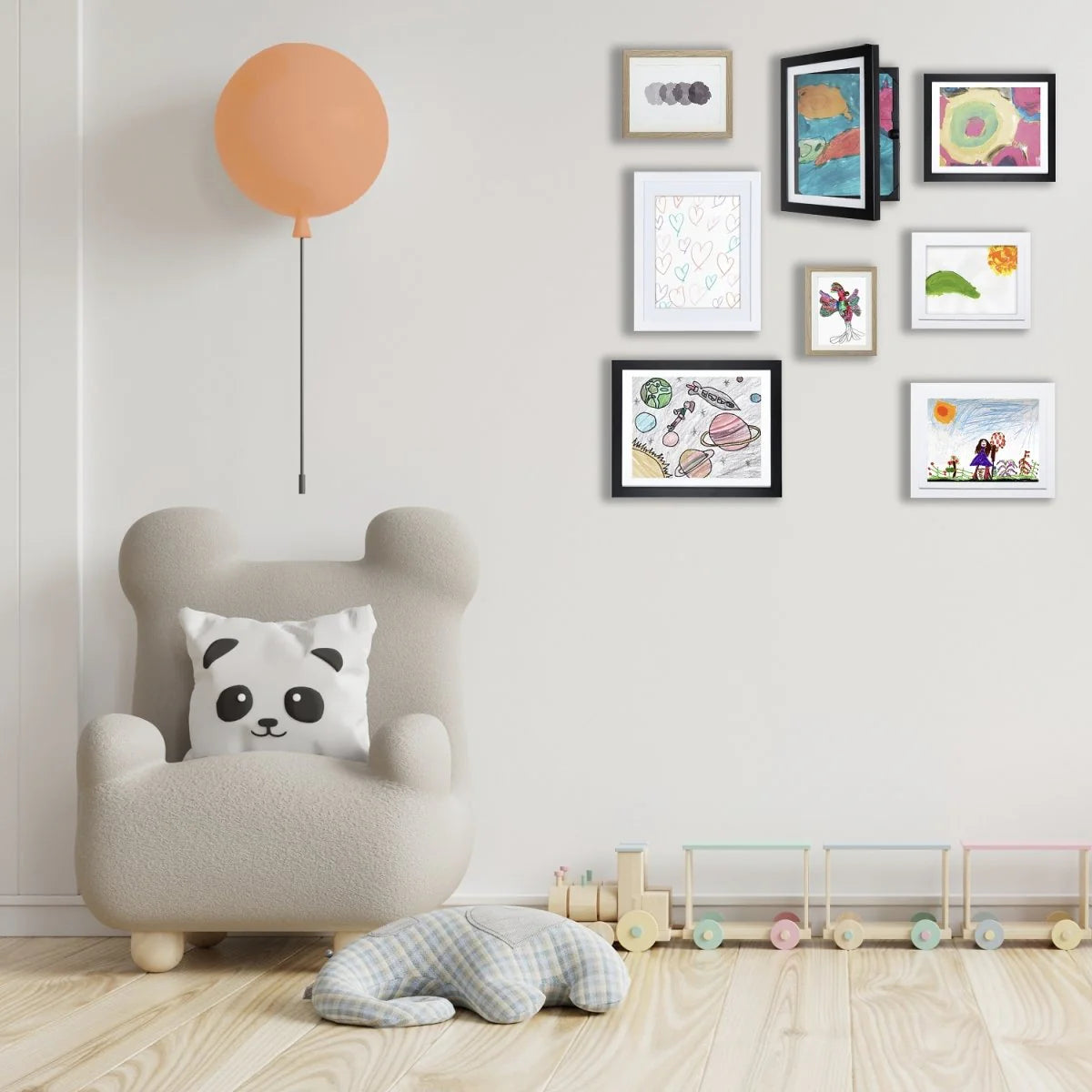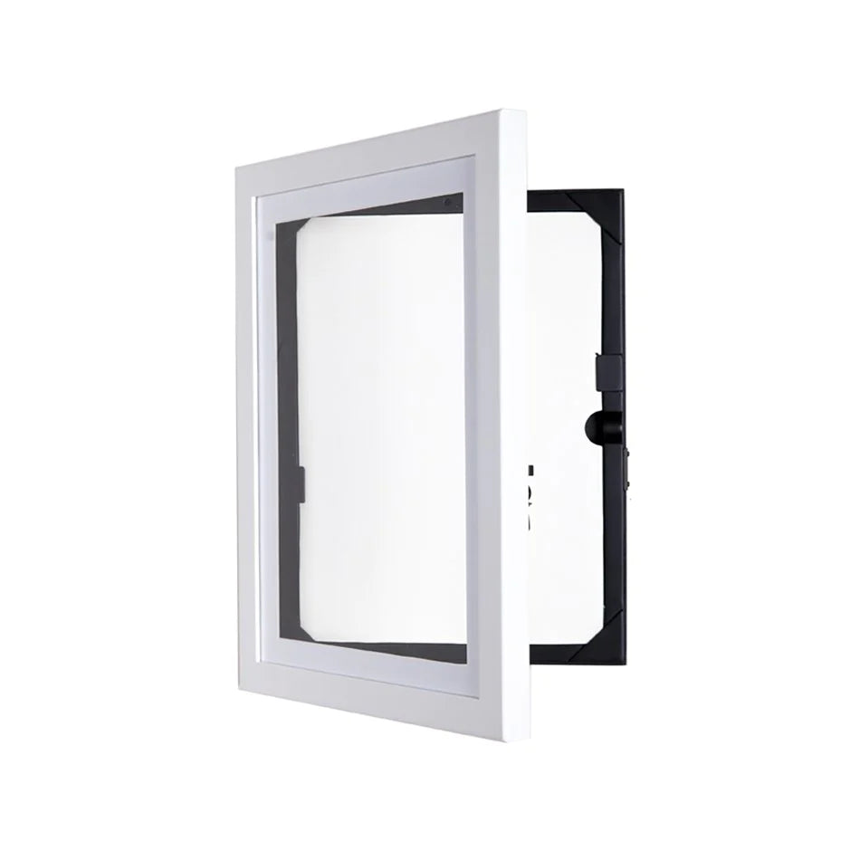 Med denne smarte rammen i A4 og A3-format kan du vise opp og oppbevare opp til 50 ferdig tegninger. Rammen åpnes enkelt på fremsiden noe som gjør det enkelt å ta ut og legge til ytterligere tegninger. Tøm kjøleskapsdøren for tegninger og la den lille kunstneren få holde vernissage inne på barnerommet.