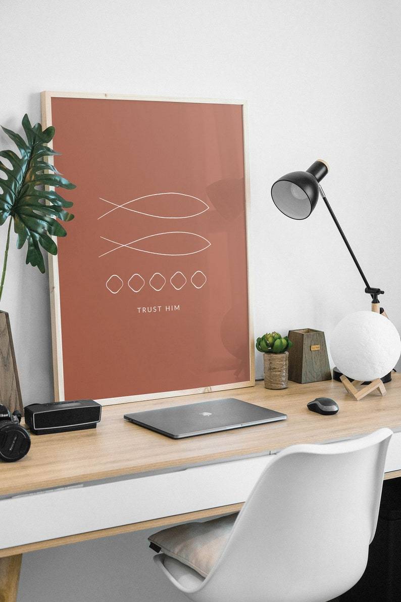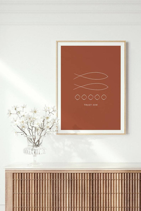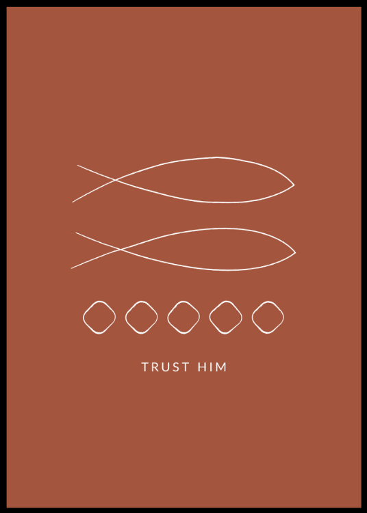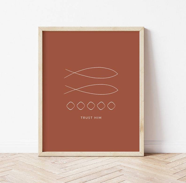 Moderne kristen kunst med 5 brød 2 fisker fra Jesus mater de fem tusen, Matteus 14:13-21