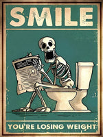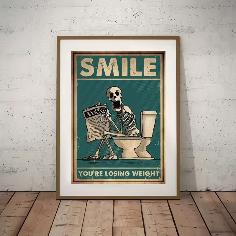 Smile – You’re Losing Weight er plakaten som garantert får gjester til å trekke på smilebåndet. Med et retroinspirert uttrykk og et humoristisk motiv av et skjelett på toalettet, spiller plakaten på klassisk, litt mørk humor som passer perfekt på badet.