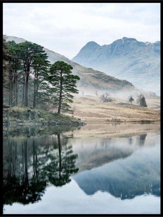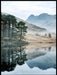 Plakat med nydelige naturlige omgivelser. Legg merke til detaljene hvor man kan se speilbildet av fjell og skog i vannet.