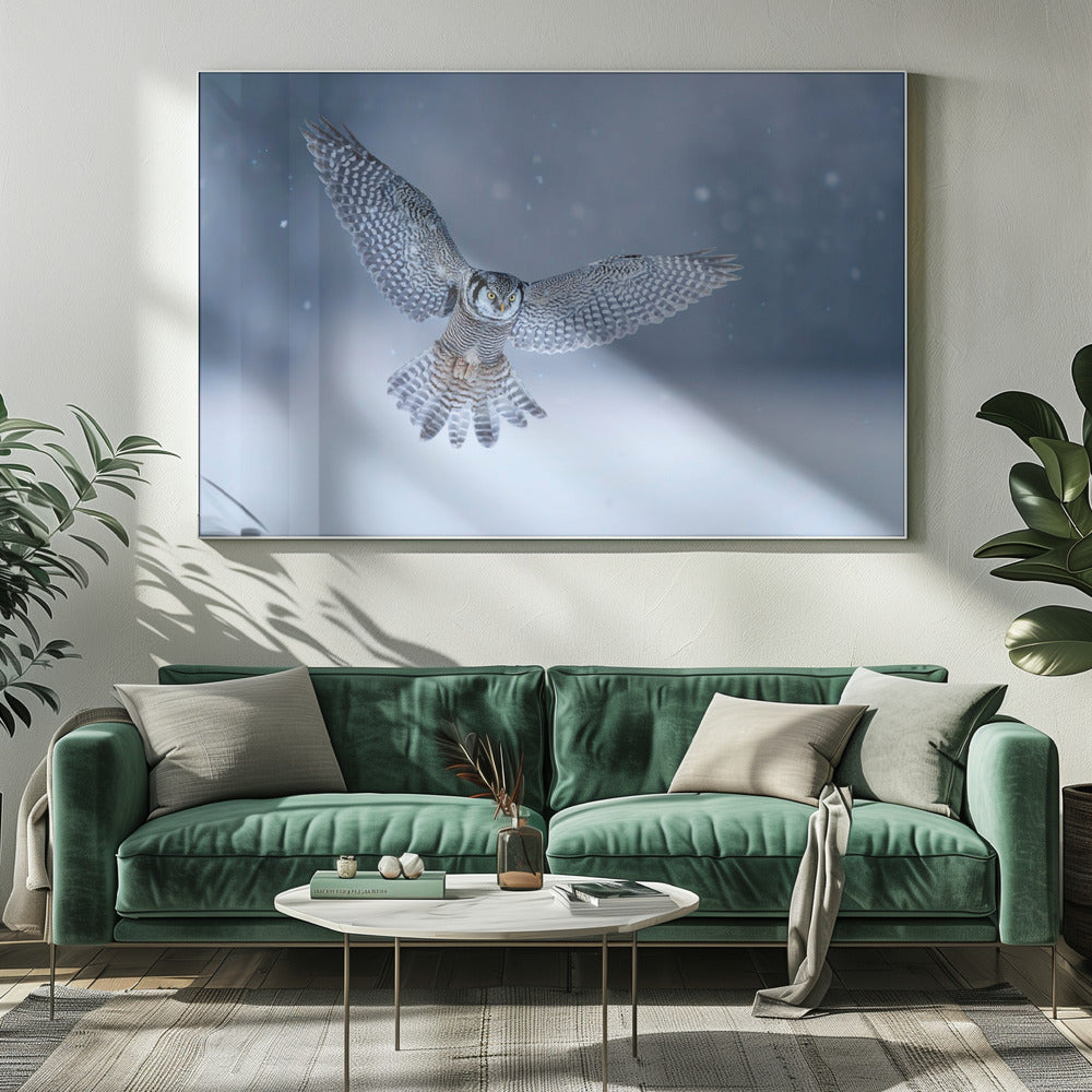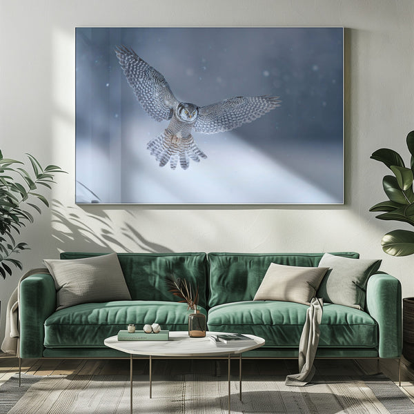 • Etter printing spennes lerretsduken på en kraftig blindramme. For de fleste formatene bruker vi en 40mm tykk ramme, slik at det oppnås en flott dybde-effekt når rammen henges på veggen. Deretter monterer vi på oppheng med stålvaier og kunstverket ditt kan henges rett på vegg.