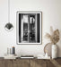 Sort hvitt plakat hvor man ser Paristårnet gjennom et vindu.