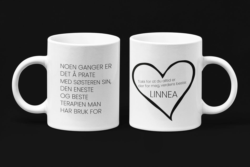 Koselig krus til en søster eller venninne som du setter stor pris på. Du velger selv om sitatet skal inneholde søster eller venninne, og du skriver selv inn navnet på den som skal få kruset.