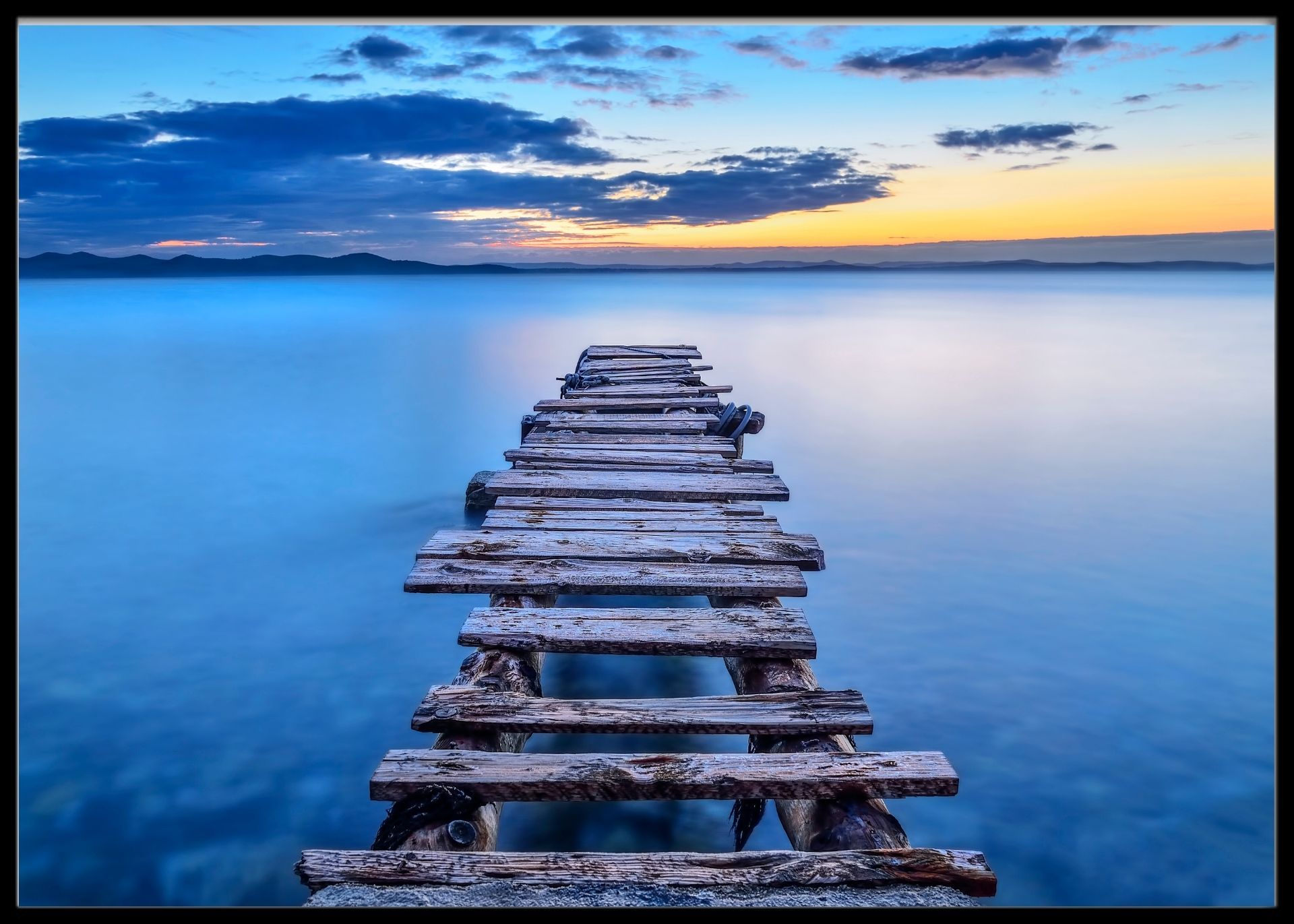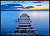 Plakat av et landskapsbilde med brygge og hav i flott fargeskala