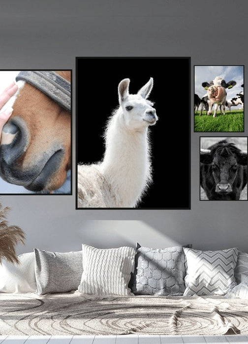 En stilig poster av lama. Dette bildet er laget med mørk bakgrunn og en hvit lama. En av våre bestselgere av plakater av lama.