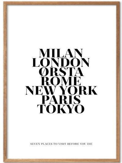 Plakat med verdensmetropolene og ditt hjemsted? Sort tekst på hvit bakgrunn