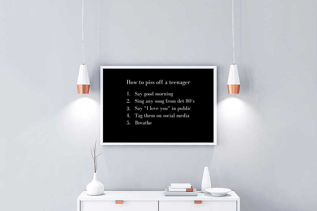 Den dagen man får en tenåring i huset, kan det fort bli en litt annen stemning. Denne plakaten er ment til å le av, og kan gjerne være en morsom gave til en tenåring.