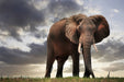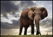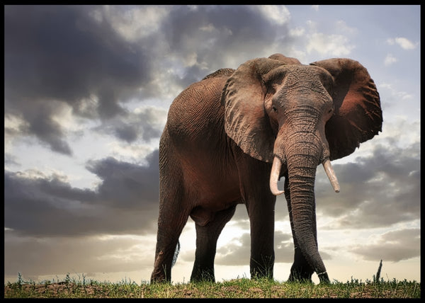 Majestetisk plakat av stor hanelefant som virker enda større fra et lavt perspektiv. Flott og dramatisk himmel som bakgrunn.