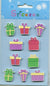 Brett med ti stickers, pakker/presanger, i ekte tre. Glimrende til dekorasjoner, kort etc.