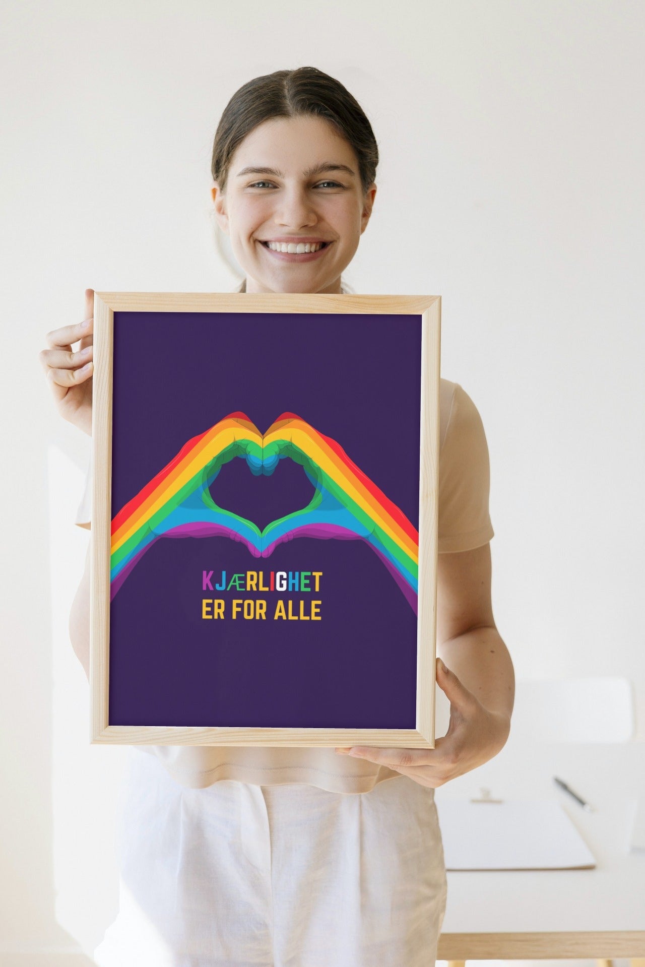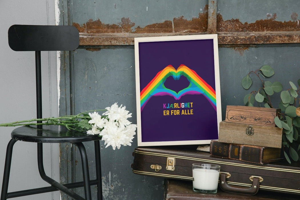 En fin prideposter med ordene KJÆRLIGHET ER FOR ALLE.