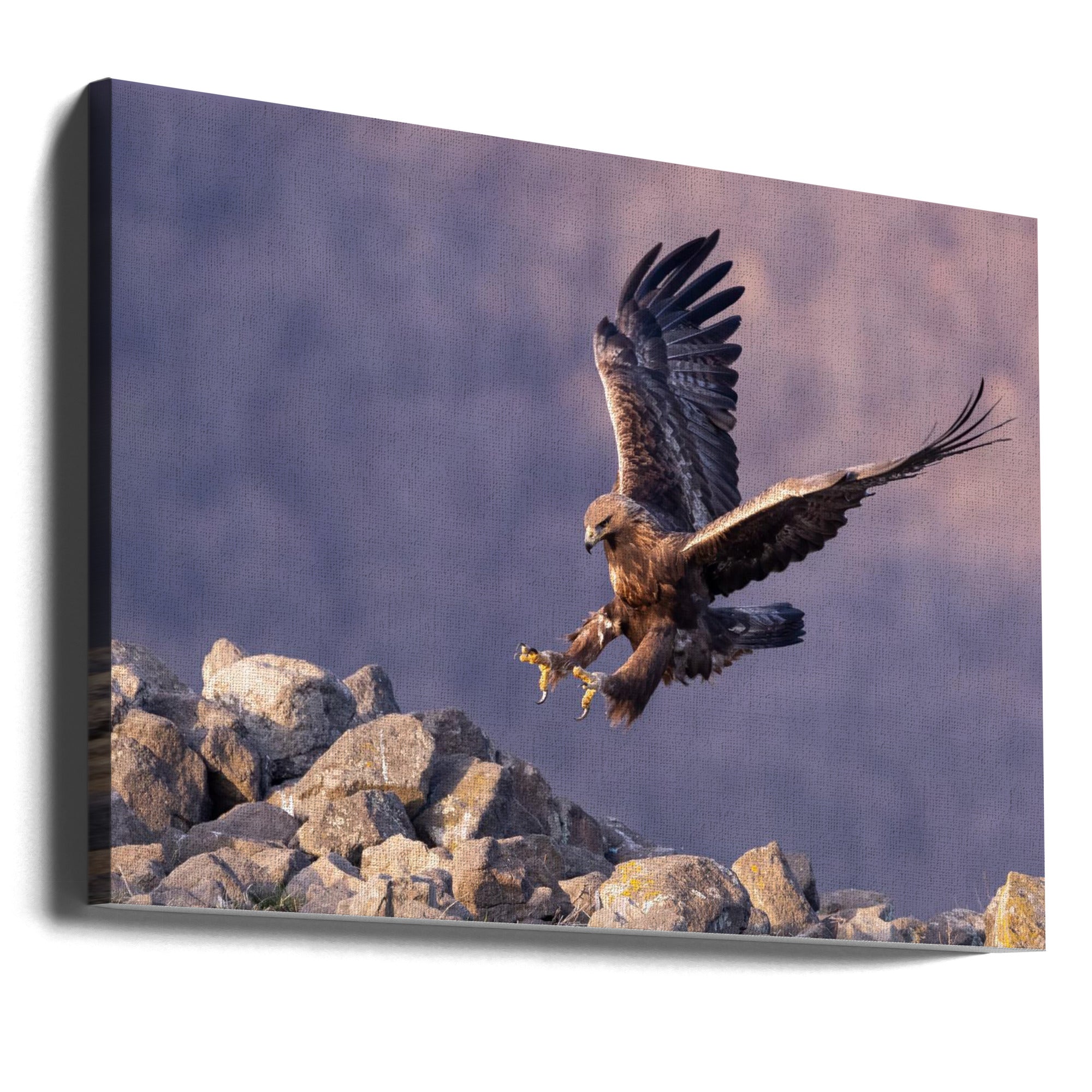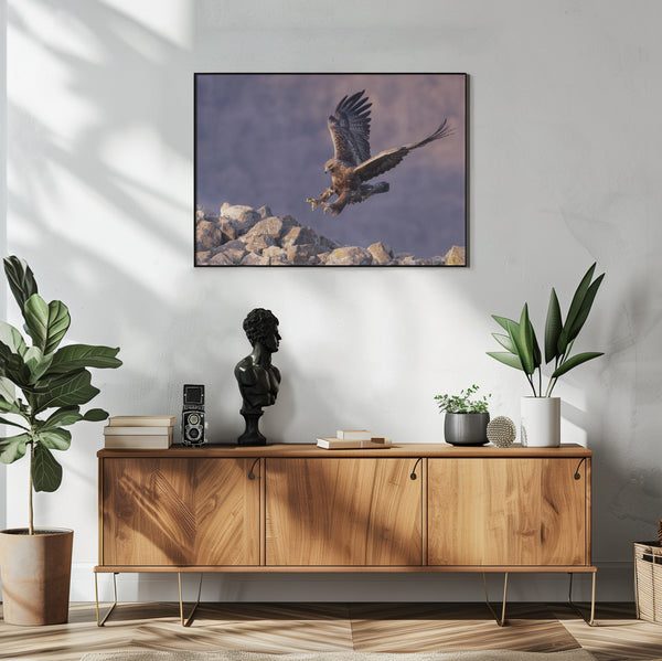 • Etter printing spennes lerretsduken på en kraftig blindramme. For de fleste formatene bruker vi en 40mm tykk ramme, slik at det oppnås en flott dybde-effekt når rammen henges på veggen. Deretter monterer vi på oppheng med stålvaier og kunstverket ditt kan henges rett på vegg.