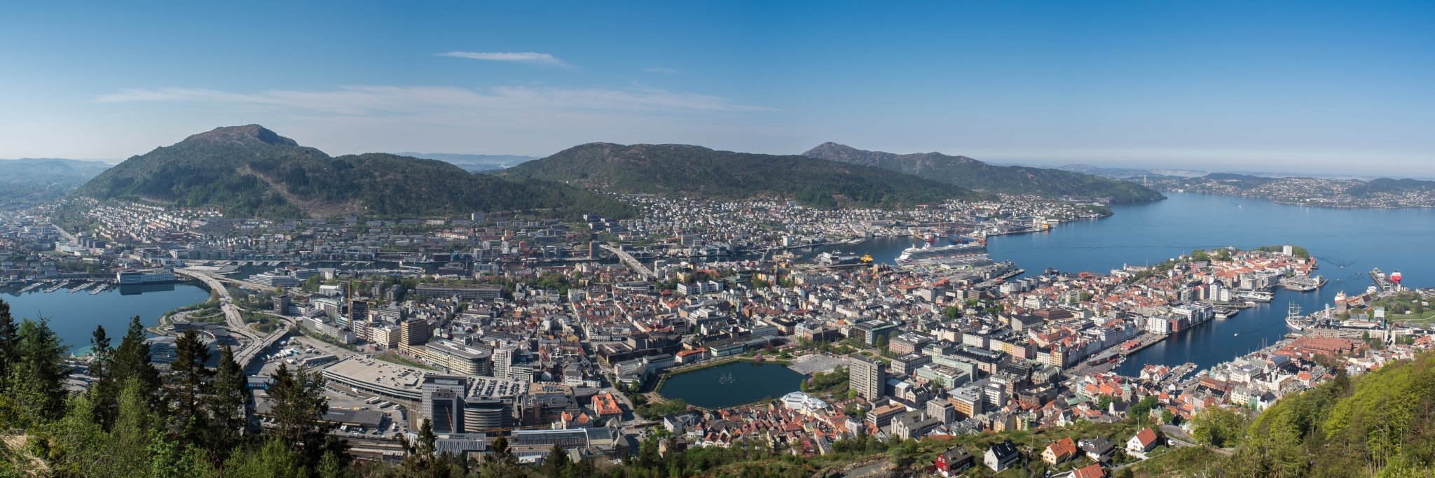 Et kjempeflott sommerbilde fra Bergen, i langstrakt panorama format.