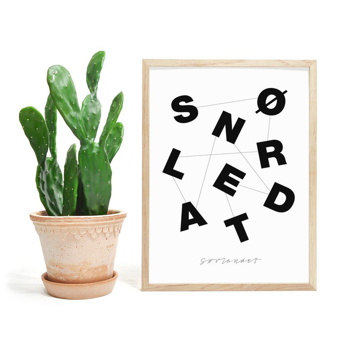 Stilren og tidløst plakatdesign med teksten "SØRLANDET". 9 bokstaver.