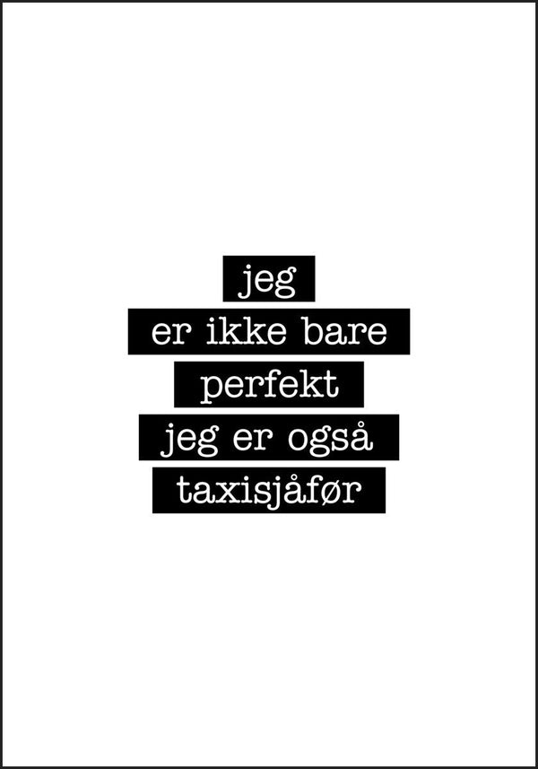 Plakat med teksten: Jeg er ikke bare perfekt jeg er også TAXISJÅFØR :)