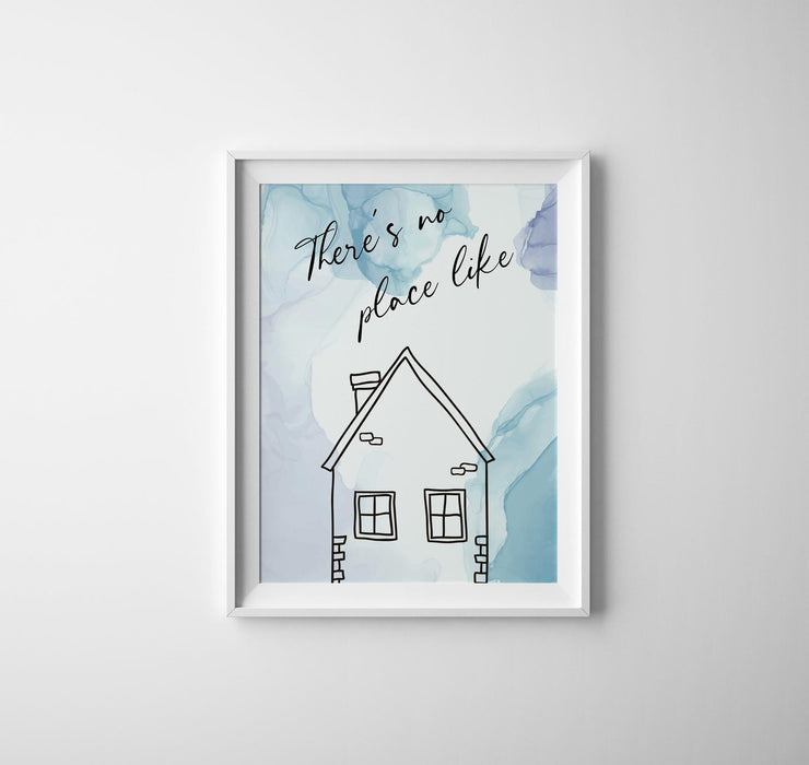Koselig plakat til hjemmet med teksten "Theres no place like" og illustrasjon av et hus.