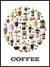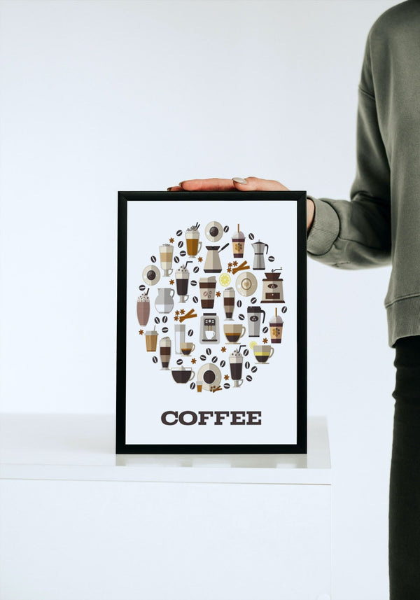 Plakat til kjøkkenet i fine farger som viser ulike typer kaffe. Kombiner gjerne sammen med andre kjøkkenplakater.