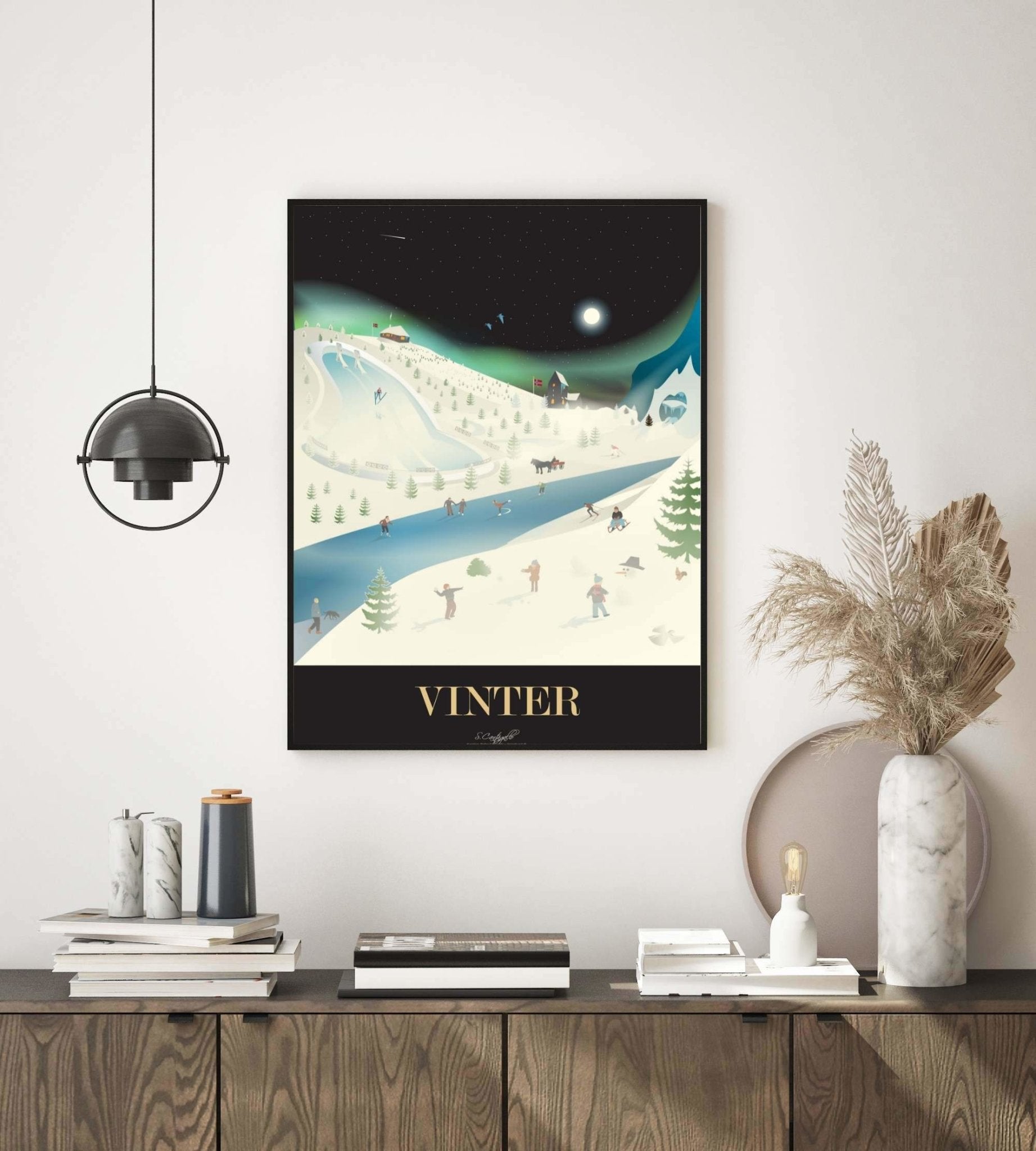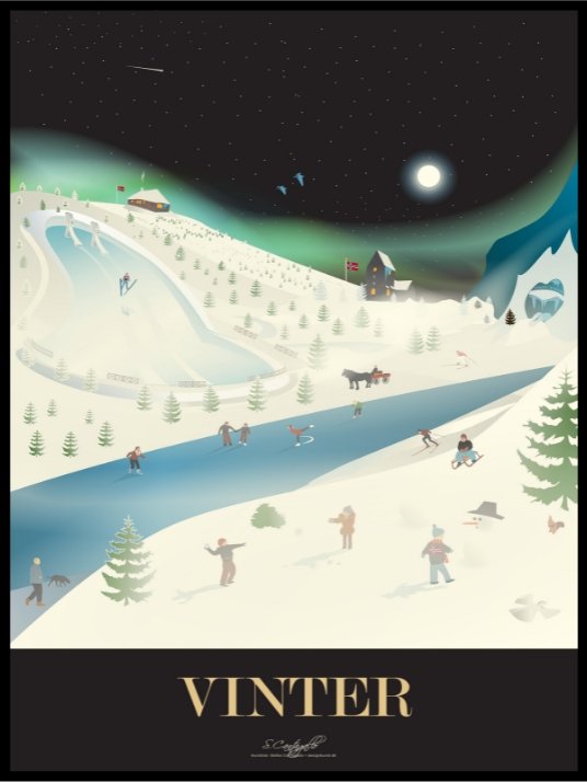 Fantastisk vintermotiv av Norge. Legg merke til detaljene i plakaten med nordlyset, skihopperen, norske flagg, osv.