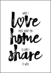 "What I love most about my home is who i share it with" eller på norsk; "Hva jeg elsker med hjemmet mitt er dem jeg deler det med".
