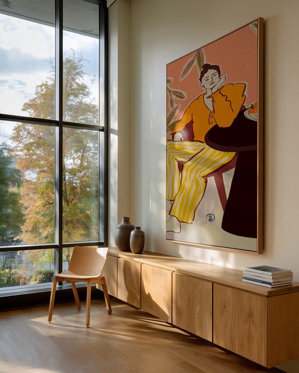 • Etter printing spennes lerretsduken på en kraftig blindramme. For de fleste formatene bruker vi en 40mm tykk ramme, slik at det oppnås en flott dybde-effekt når rammen henges på veggen. Deretter monterer vi på oppheng med stålvaier og kunstverket ditt kan henges rett på vegg.