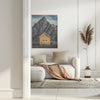 - Etter printing spennes lerretsduken på en kraftig blindramme. For de fleste formatene bruker vi en 40mm tykk ramme, slik at det oppnås en flott dybde-effekt når rammen henges på veggen. Deretter monterer vi på oppheng med stålvaier og kunstverket ditt kan henges rett på vegg.